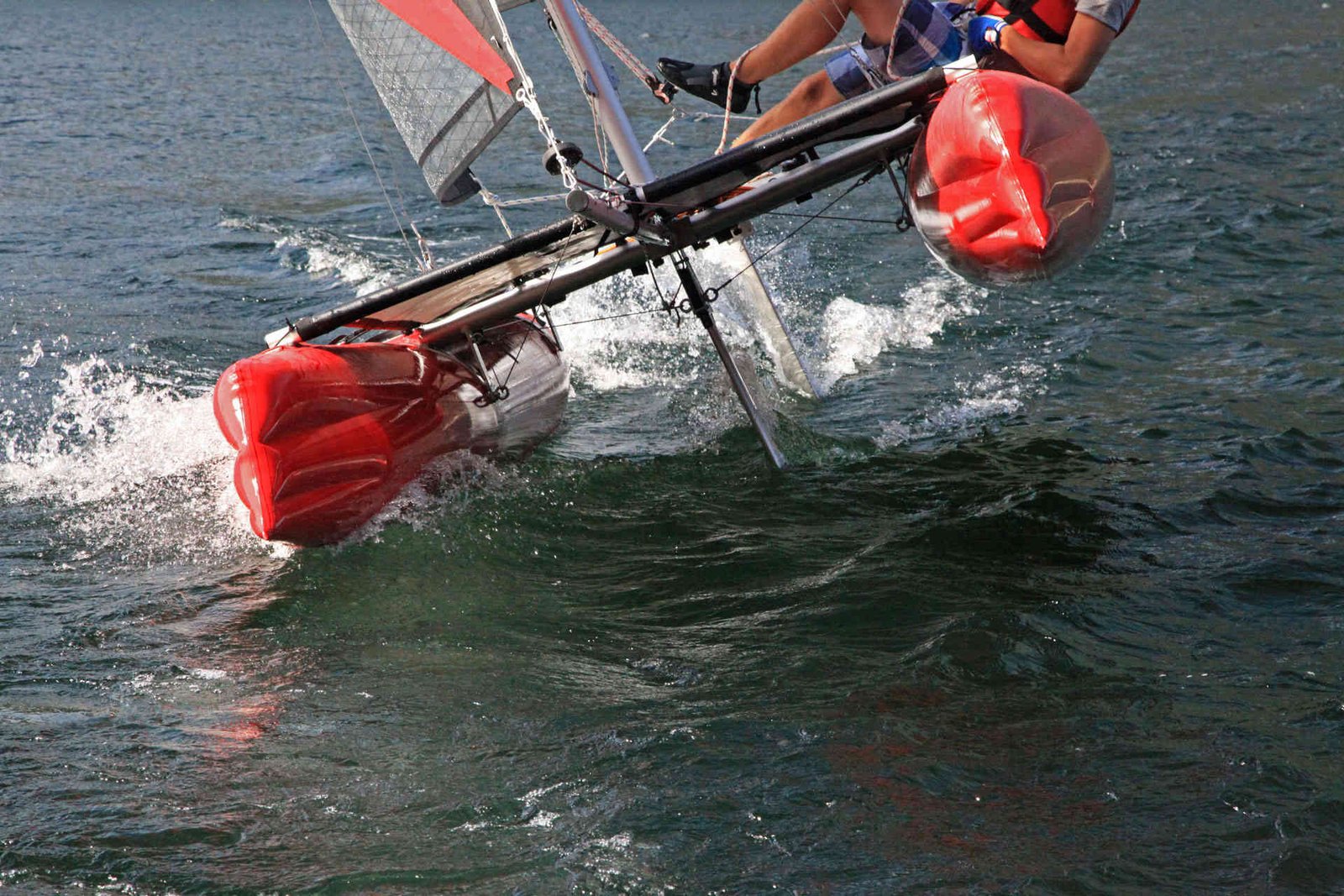 Du fait de son faible poids c’est un bateau très vivant, très réactif dans les petits airs, en plus il chante très bien avec une voix claire, limpide, c’est étonnant avec ces flotteurs caoutchouc mais c’est ainsi, et ça rappelle aussi le dériveur.