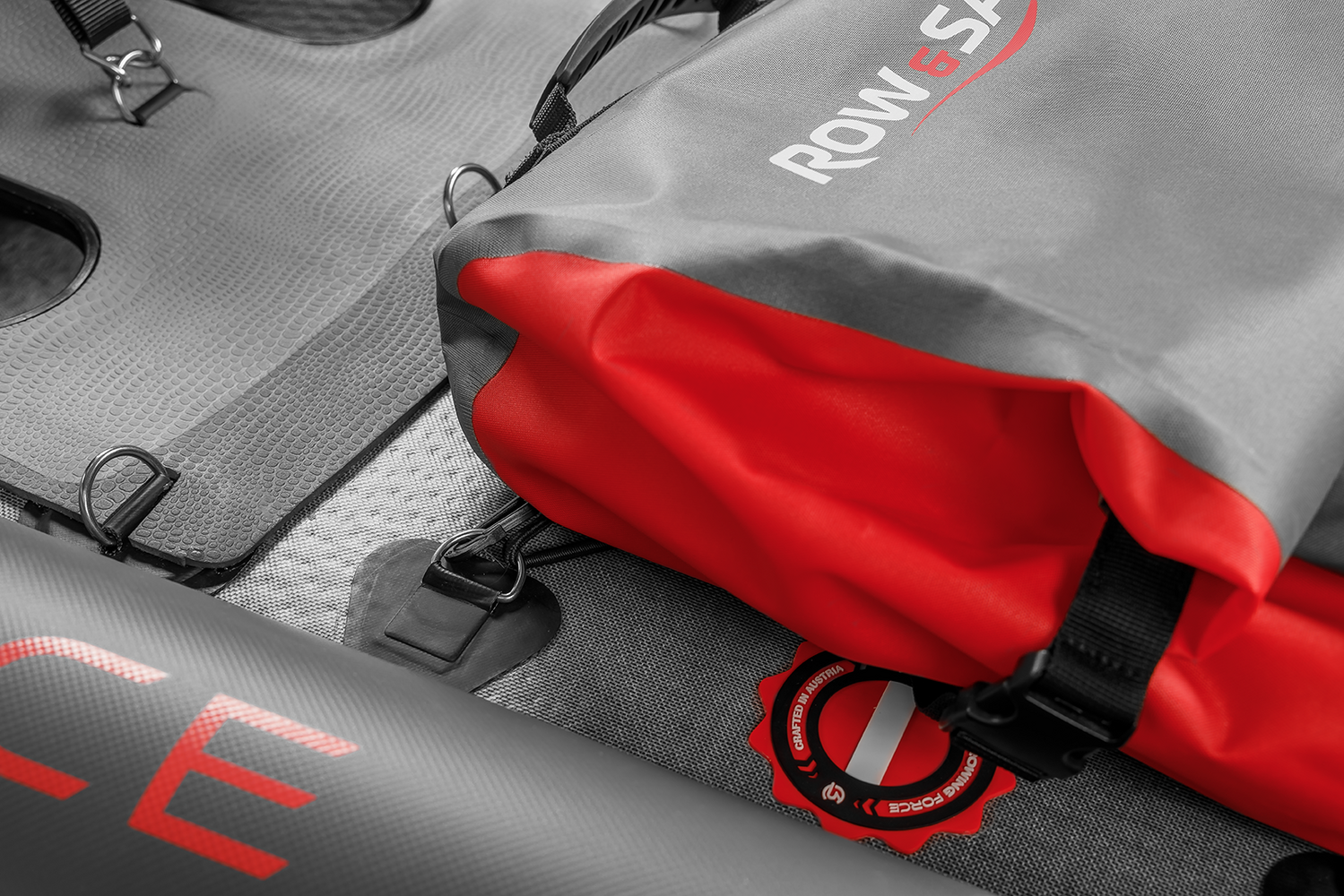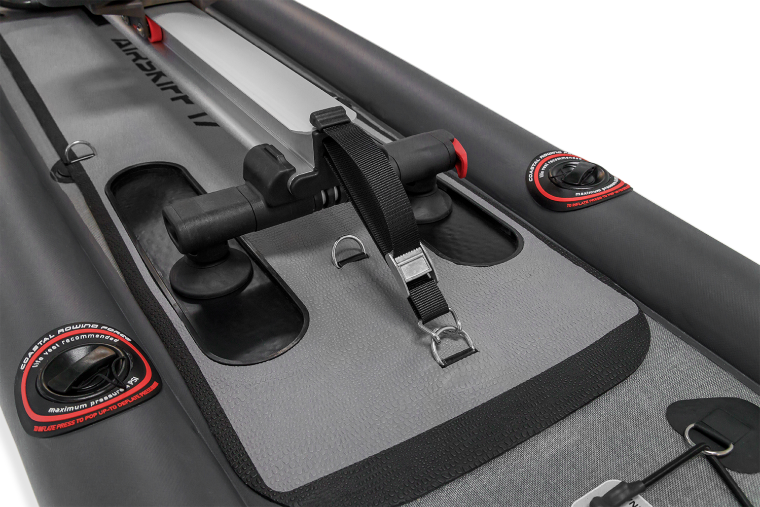 Pour une expérience de navigation optimale, positionnez simplement le rail d’aviron sur la surface indiquée et fixez-le aux anneaux en D pré-montés. Serrez la ceinture pour attacher le rail d’aviron RowVista® ou RowMotion® à votre AIRSKIFF 17.